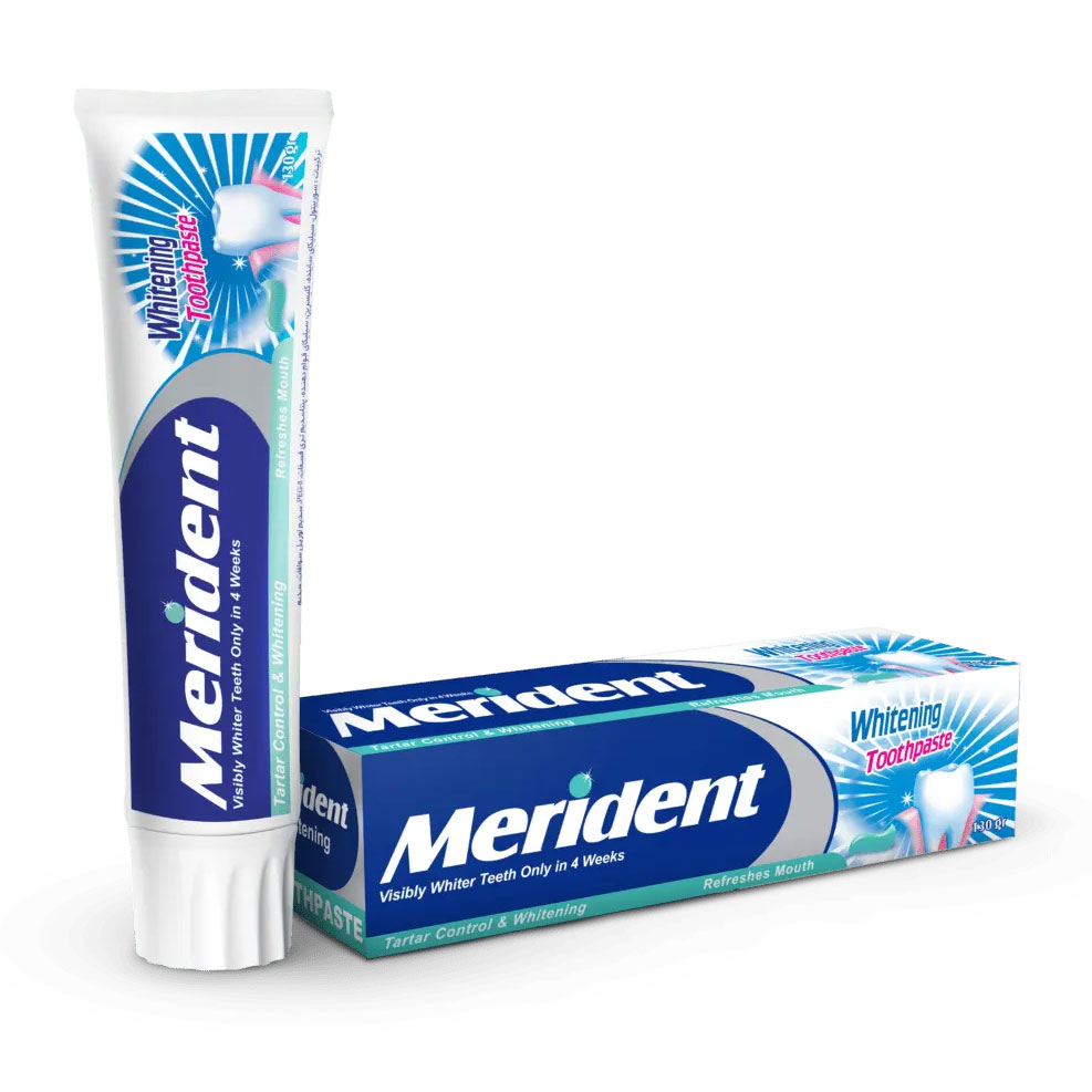 خمیردندان سفید کننده مریدنت محصولی ایمن با مکانیسم موثر، جهت حذف و ممانعت از تشکیل لکه های دندانی موجود بر سطح مینای دندان می باشد. این محصول حاوی ترکیبات ساینده استاندارد، جهت سایش و پولیش مینای دندان (بدون آسیب به آن) بوده و همچنین با دارا بودن ترکیبات موثر فسفات در فرمولاسیون خود، توانایی کاهش لکه های دندانی در درازمدت را دارد. همچنین این محصول با میزان یون فلوراید استاندارد ( ppm1450) ، مانع از پوسیدگی دندان ها می شود و ترکیبات کیلیت کننده فسفاته گنجانده شده در فرمولاسیون آن علاوه بر حذف لکه های دندانی با جذب يون های مزاحم از تشکيل جرم های کلسيته بر روی دندان و تشکیل تارتار که ظاهر ناخوشایند زردی را در کنار بیماری های دندانی ایجاد می کند، جلوگيری می کند.