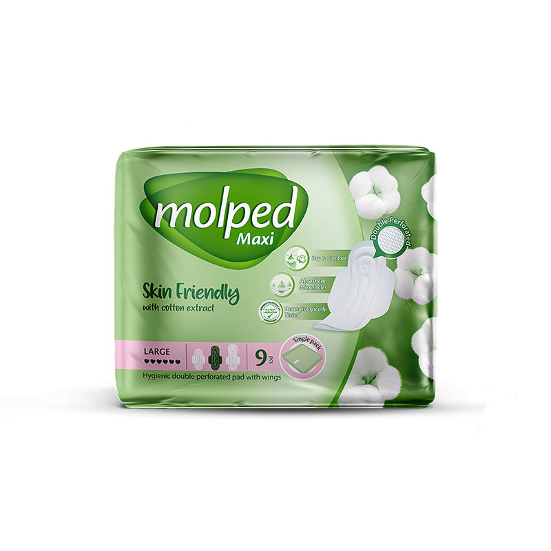 نوار بهداشتی بالدار ضخیم پنبه ای مولپد سایز بزرگ در بسته بندی 9 عددی میباشد. این محصول با محافظت خیلی خیلی زیاد در برابر نشتی، سازگار با پوست، همراه با عصاره پنبه یک انتخاب مناسب برای بانوان در دوران قاعدگی است
